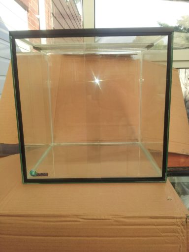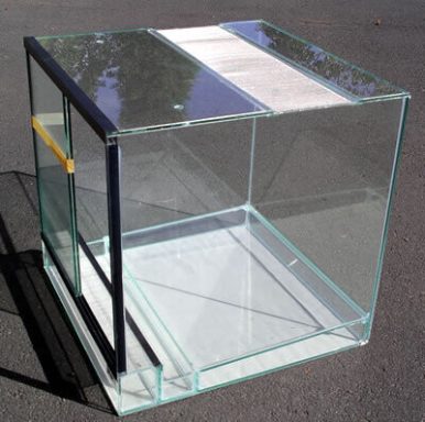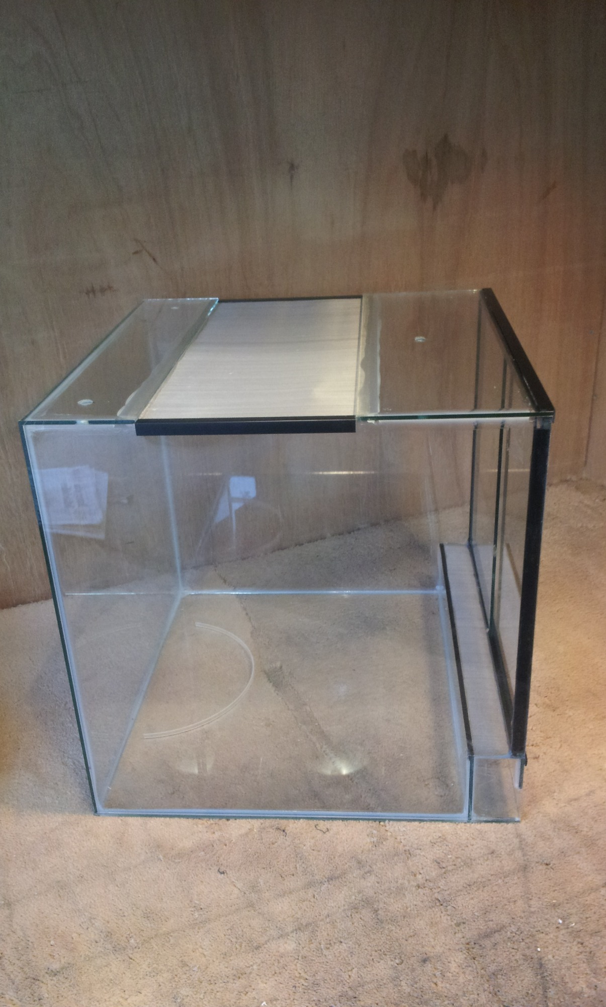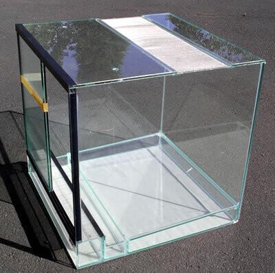All-glass (4mm thick) vivarium with sliding front access glass doors, top stainless steel mesh vent plus lower-level front vent. 2 x 10 mm hole drilled in top for misting and 1 x 10mm holed drilled for lighting cable. False bottom slopes into gully to allow drain off of excess water or water circulation system. 21 mm hole drilled in gully for drain set or silicone bung. Ideal for Dendrobatids.
